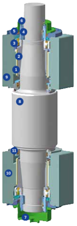 корпуса, быстроходные вал - шестеренки, установочные (регулировочные) втулки, зажимные цанги, кольца вращающиеся, шевронные уплотнения, приводные конические шестерни