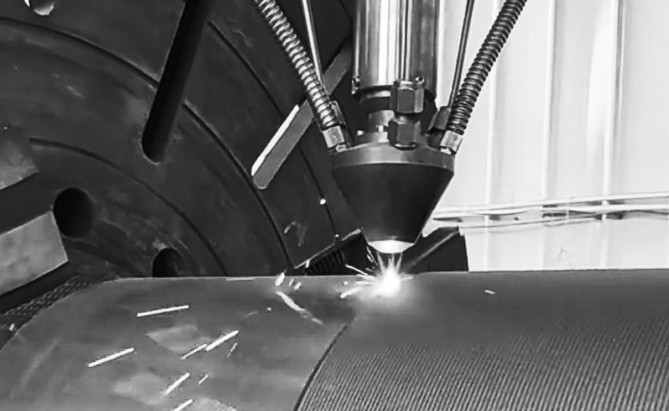 Лента подаётся с помощью гидравлических приводов, соединяется сварочной головкой и отрезается гидроабразивом.
